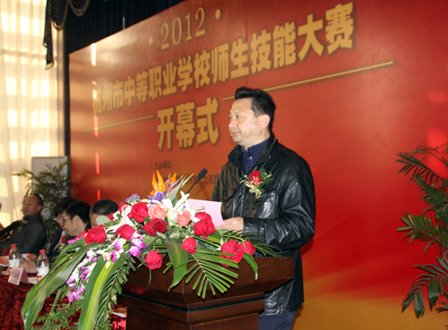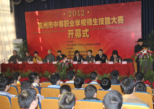 2012年杭州市中等职业学校师生技能大赛开幕式现场。  近300位来自各职校师生代表和企业代表参加了大赛开幕式。  杭州市教育局副局长马里松寄语大赛。  市人力资源与社会保障局副局长黄菊火宣布大赛开幕。  各主办单位、承办单位领导参观江滨职校现代物流参赛项目。 本网讯:为促进我市中等职业学校师生专业技能水平,切实加强技能型人才培养,挖掘出一批技能精湛的教师和学生中的“技能之星”。 今天上午,2012年杭州市中等职业学校师生技能大赛在杭州市电子信息职校拉开帷幕。市教育局副局长马里松、市人力资源与社会保障局副局长黄菊火、市教育局高中处处长黄建民、市人力资源与社会保障局职业能力建设处处长骆锦伦、市职教研究室主任张金英、市职业技能鉴定指导中心主任王为民等领导出席了开幕式。杭州市各中等职业学校参赛师生代表300余人参加会议。开幕式由杭州市职业技术研究室钱锋副主任主持。