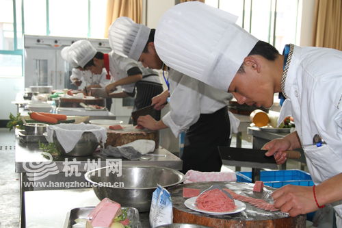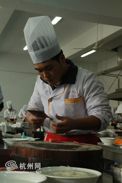 2012年杭州市中等职业学校师生技能大赛中的“烹饪”竞赛项目于12月14日在杭州市良渚职业高级中学举行,112名来自全市中等职业学校的师生参加了该项比赛,上图为中餐冷菜比赛现场。