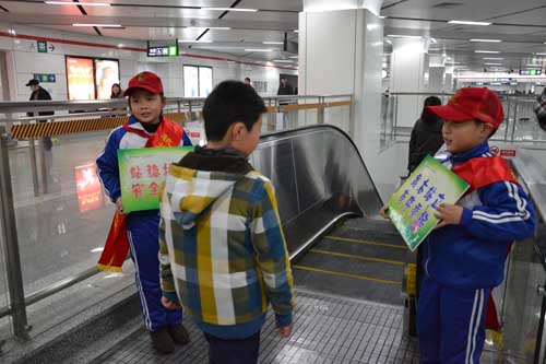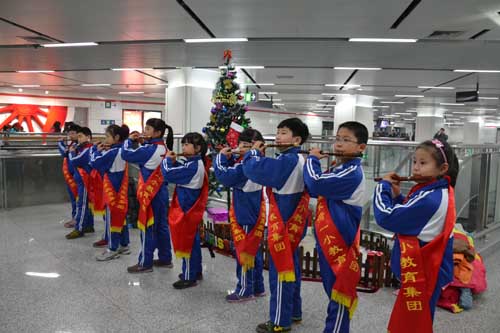 采荷一小的二十几名师生在杭港工作人员的带领下,来到了地铁1号线城站站。小使者们分成三个行动小分队,第一小分队为10名多才多艺的吹笛子小使者,在站厅的圣诞树旁吹奏出圣诞的欢乐气氛,迎接圣诞节的到来。第二小分队为安全乘梯小使者,站在自动扶梯旁,手举安全乘梯告示牌,向过往的叔叔阿姨和爷爷奶奶们发出安全乘梯的温馨提醒,并发放安全文明乘车小卡片,受到乘客的高度赞扬。第三小分队的小使者们在站内展示他们亲手制作的地铁安全文明宣传漫画,并让过往的乘客为宣传画进行评选。在一片悠扬欢快的笛声中,小使者们的身影忙碌在城站站厅的每一个角落,和谐、文明,未来、希望,我们欣喜于这一切的蔓延。