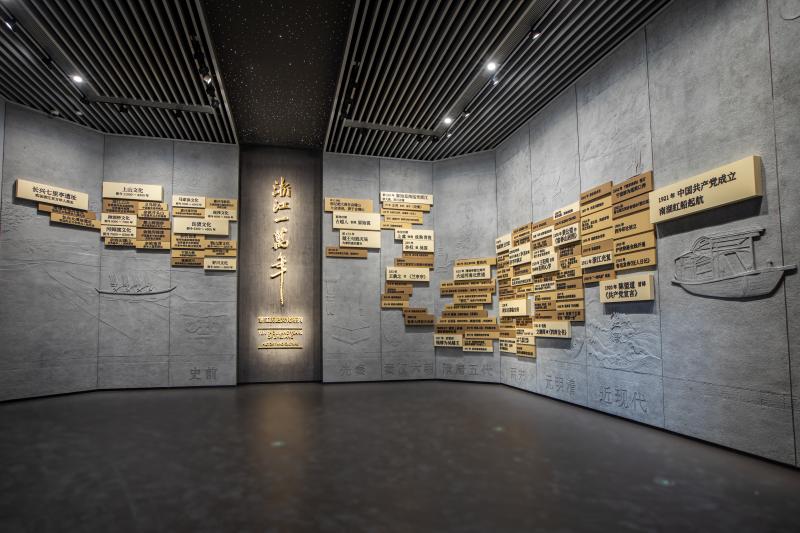 在《浙江一万年——浙江历史文化陈列》序厅,浙江万年百件大事记以“之”字形依次展开,以时序为脉络,呈现浙江地区各个历史时期最具代表性的文物遗存和文明印记,观众可以直观地感受浙江一万年历史文化的高光亮点。整个展览共有2000多件展品,占据了整个展馆展品数的半壁江山。