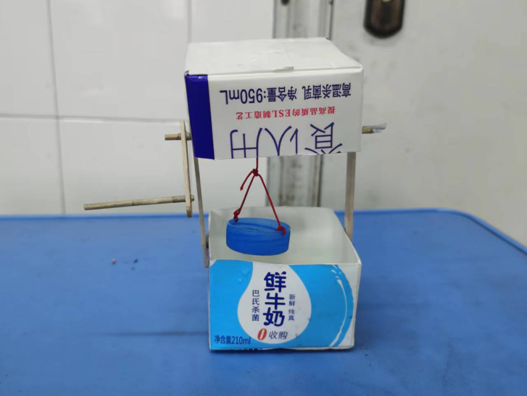 这是用牛奶纸盒和瓶盖、木棍、丝线制作的可以“入海”的“小水井”,只要轻轻转动杠杆就可以盛水上来啦!