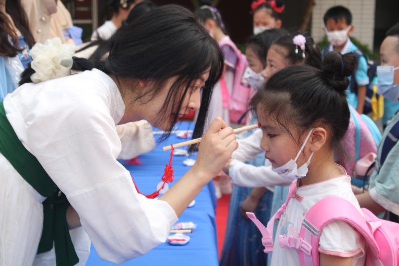 入学典礼上,启蒙老师们端起朱砂,在一年级的学子们的额头正中点上“红痣”,寓意孩子们能够开启智慧,眼明心亮,心灵手巧,多读书,读好书。击鼓三声,鼓声咚咚以示学生从此目明耳聪、茅塞顿开,敲响的每一声都孕育着一个崭新的希望,同学们边击鼓边宣誓:“我是一名小学生,我要做到:敬长辈,明志向;爱学习,勤努力;学礼仪,知廉耻。”同学们还通过学写“人”字,学习了堂堂正正做人的道理。