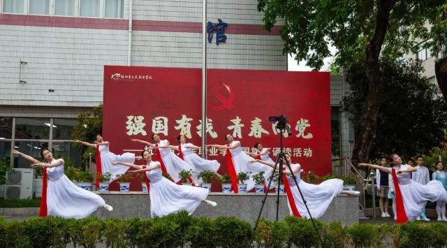 除了朗诵,同学们还用歌舞《强国一代有我在》,表达出“人民学子”心声,紧紧团结在党的旗帜下,努力学习,以青年之光,添国之荣光。