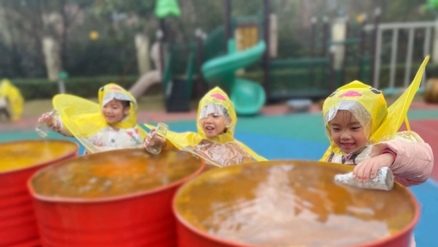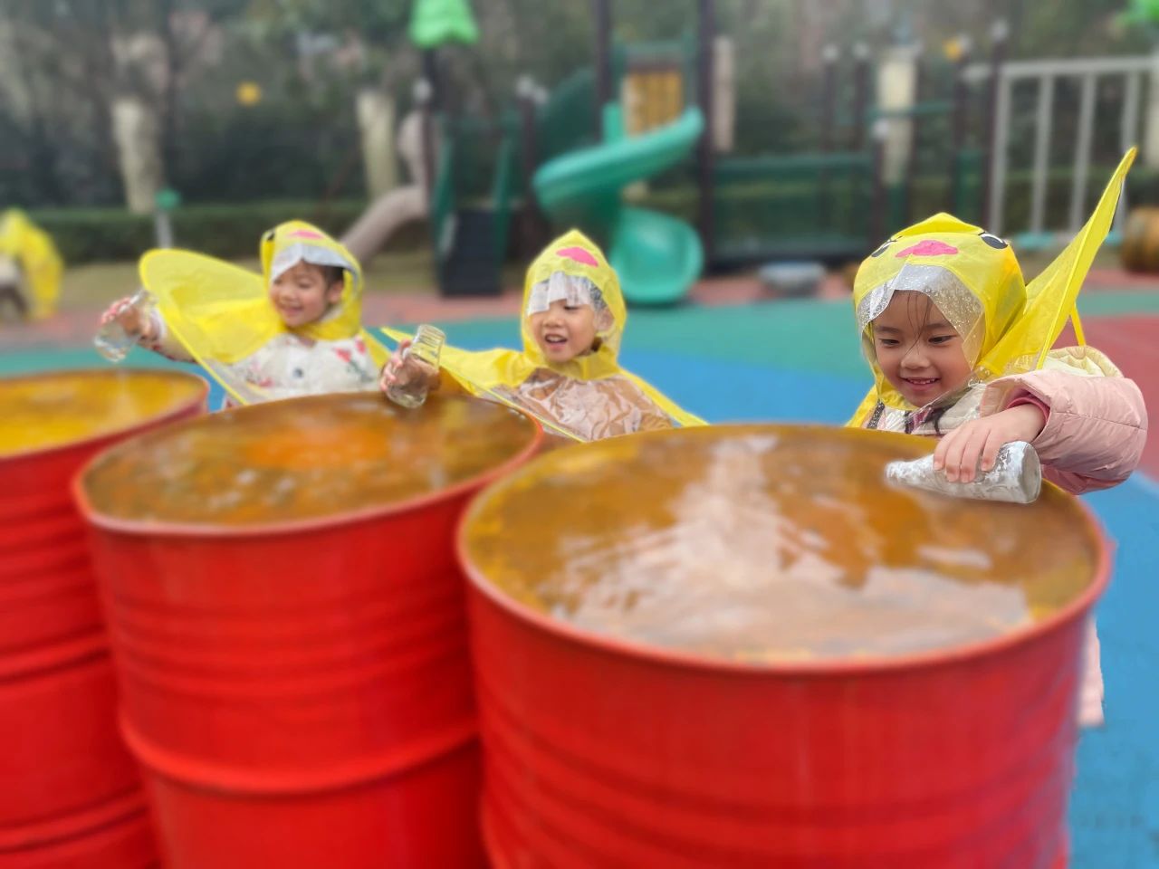 与其等雨停,不如追雨去。小伢儿们穿上雨衣,听雨滴的声音,在雨中奔跑、漫步,探索雨中的幼儿园。伢儿们最爱的活动是踩水坑。他们尽情在水坑中跳跃,感受雨水飞溅带来的美妙体验。