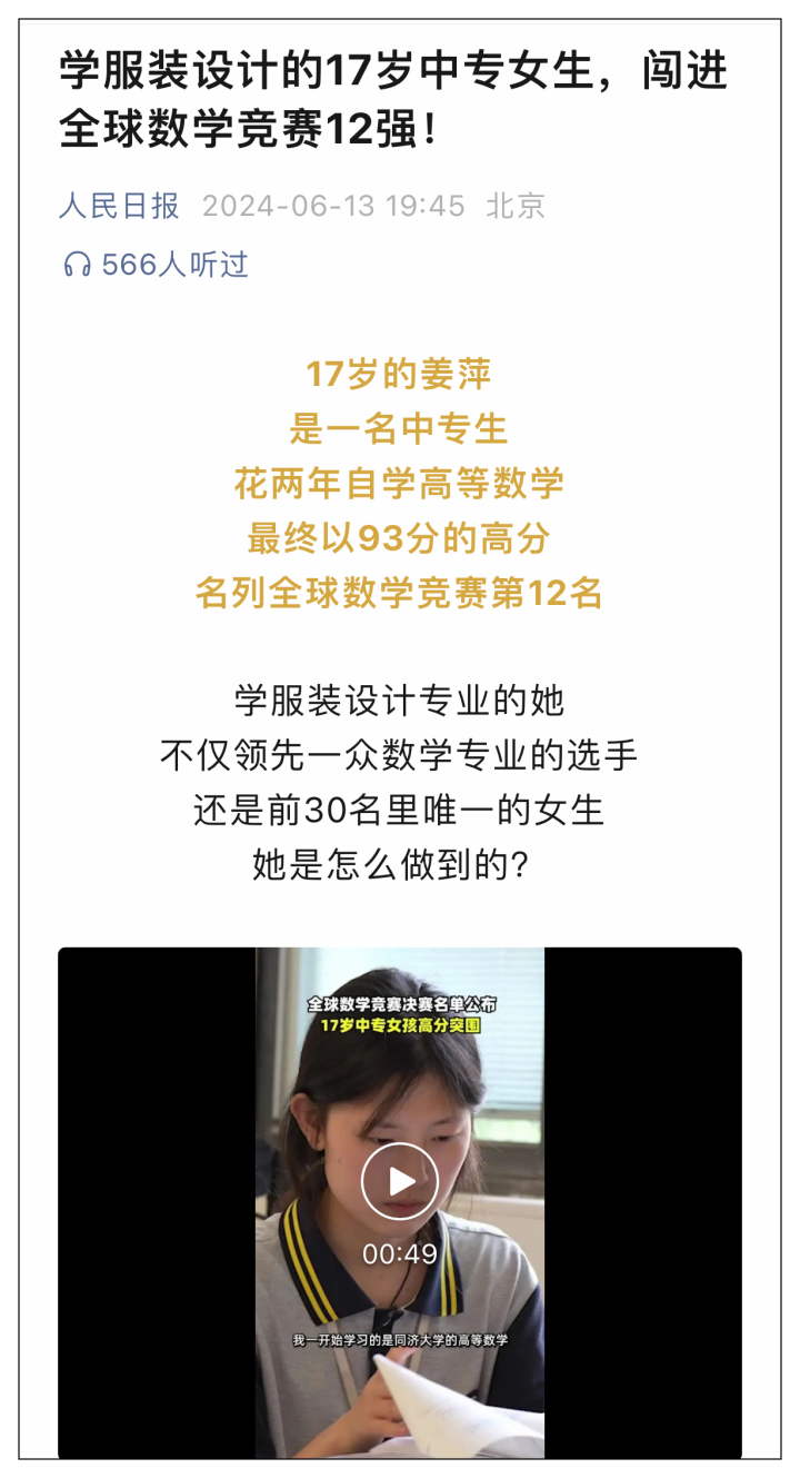 近日,橙柿互动报道了江苏省涟水中等专业学校数学天才少女姜萍的故事,傍晚被《人民日报》公众号转载。