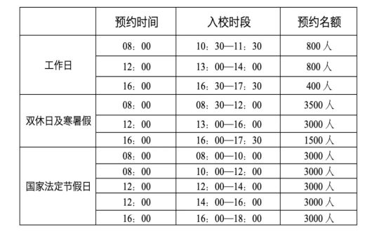除周一外每日开放校园。入校时间为9:00-11:30或14:30-17:00,于18:00前结束参观。