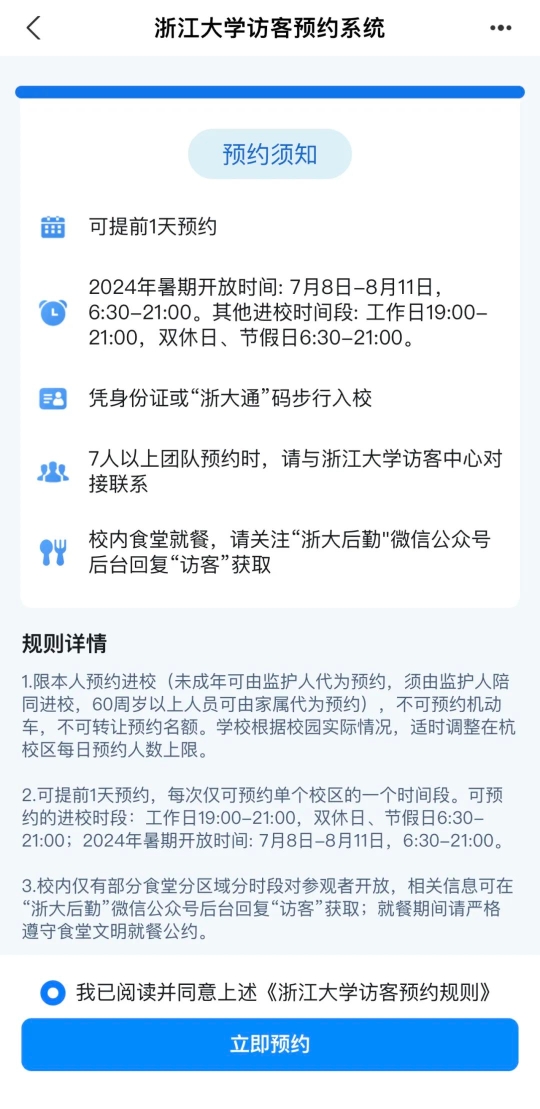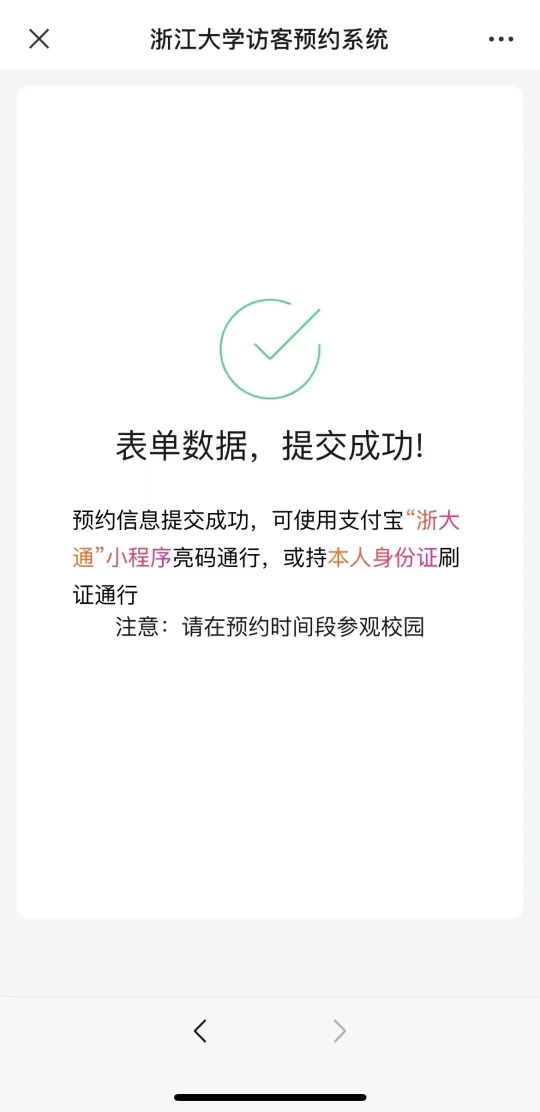 通过浙江大学微信公众号或小程序,仔细阅读预约须知,认真填写个人信息,提前一天预约入校。预约完成后,凭身份证或“支付宝-浙大通”码,在预约时段通过人行闸机。