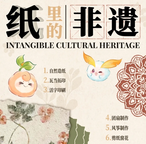 活动内容:小朋友们将跟随指导老师的脚步,从亲手制作纸张开始,深入了解“纸”对中华文化的影响,包括自然造纸、瓦当拓印、活字印刷、团扇制作、风筝制作、剪纸窗花等6种与“纸”有关的非遗项目,通过生动的表现形式,增强小朋友们对非遗的了解和喜爱。