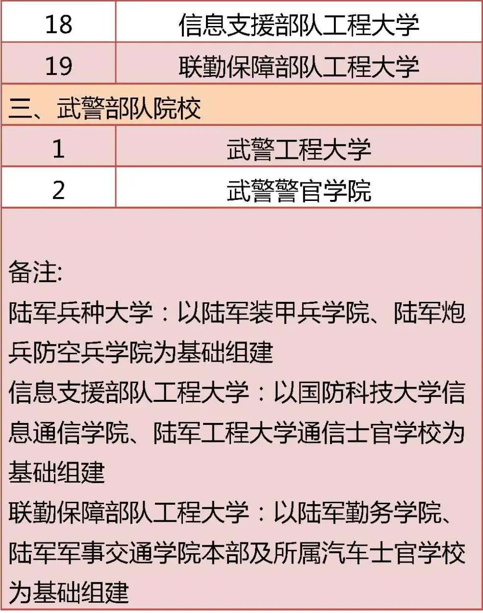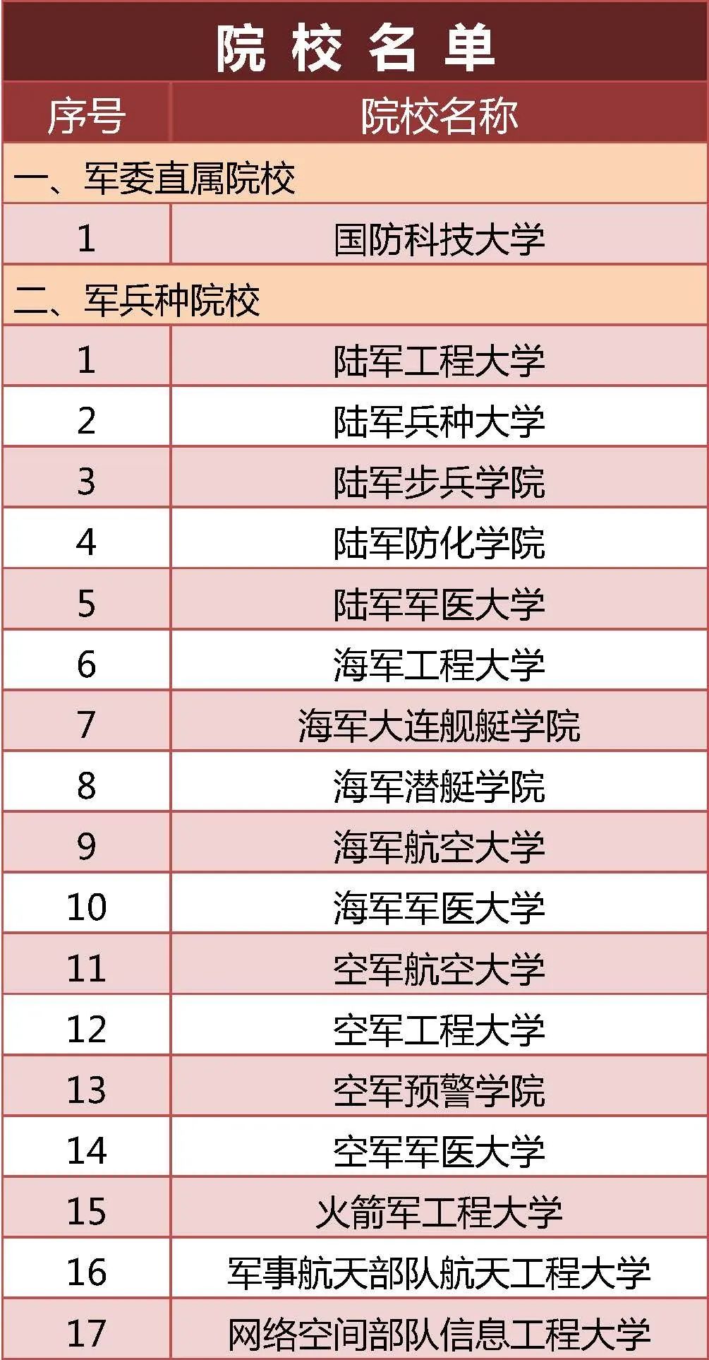 据首都教育微信公众号消息,今年,共有22所军队高等教育院校面向普通高中毕业生招生。其中,军委直属院校1所,军兵种院校19所,武警部队院校2所。