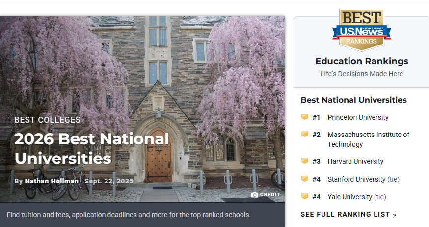日前,《美国新闻与世界报道》(以下简称“U.S.News”)发布了2026年全美最佳综合大学排名,从整体情况来看,名校排名与去年相比,基本保持稳定。“不要过度看重排名!大学排名是一项波动的参考指标,通常是由商业咨询机构发布,因为评定的参考指数不同,因此不同机构发布的排名差距很大。比如,著名的耶鲁大学、达特茅斯学院在英国某些机构发布的排名中名落孙山,甚至跌出前200名。怎样才能体现一所大学的真正价值?我觉得,学生毕业后能否成才,是否具备研究及创新的能力,能否造福社会,这才是优秀大学的人才培养核心。”在留学行业浸淫多年的专家、杭州美愿教育创始人张荣分析道。