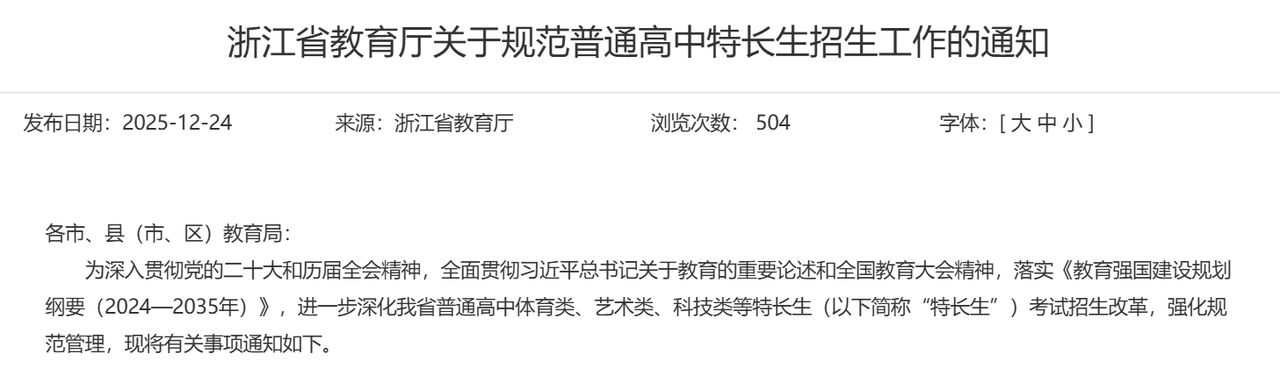 近日,浙江省教育厅发布《关于规范普通高中特长生招生工作的通知》,内容包括优化招生项目与计划、严格报考条件与资格审核、完善招生录取机制、改进考试评价方式、加大监督及违规查处力度等方面。