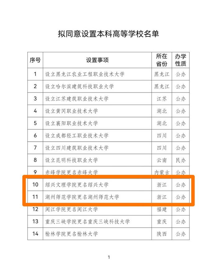 1月12日,教育部官网发布了《关于拟同意设置本科高等学校的公示》,拟同意设置黑龙江农业工程职业技术大学等14所学校,其中绍兴文理学院更名为绍兴大学、湖州师范学院更名为湖州师范大学。