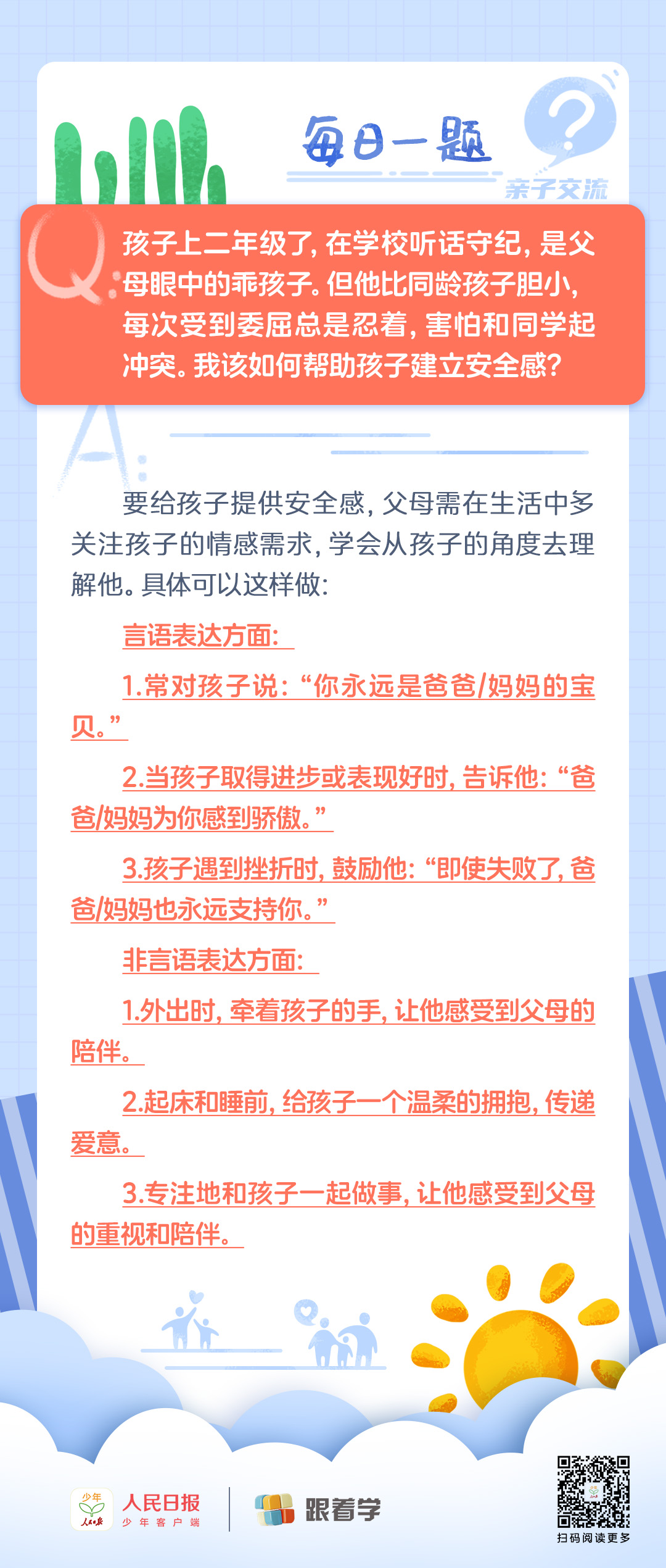 孩子上二年级了,在学校听话守纪,是父母眼中的乖孩子。但他比同龄孩子胆小,每次受到委屈总是忍着, 害怕和同学起冲突。我该如何帮助孩子建立安全感?
