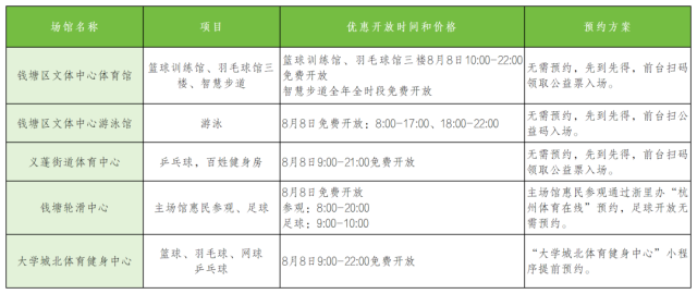 钱塘区文体中心体育馆、钱塘区文体中心游泳馆、义蓬街道中心、钱塘轮滑中心、大学城北体育健身中心5个体育场馆向大众惠民开放。
