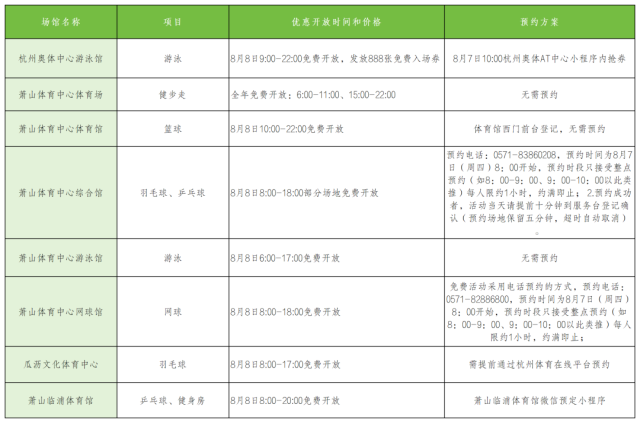 杭州奥体中心游泳馆、萧山体育中心体育场、萧山体育中心体育馆、萧山体育中心游泳馆、萧山体育中心网球馆、萧山体育中心综合馆、瓜沥文化体育中心、萧山临浦体育馆8个体育场馆向大众惠民开放。
