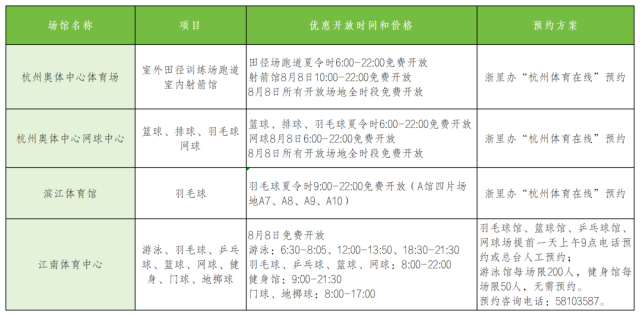 杭州奥体中心体育场、杭州奥体中心网球中心、滨江体育馆和江南体育中心4个体育场馆向大众惠民开放。