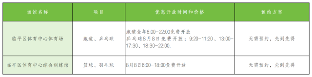 临平区体育中心体育场、临平区体育中心综合训练馆2个体育场馆向大众惠民开放跑道、乒乓球、篮球、羽毛球。