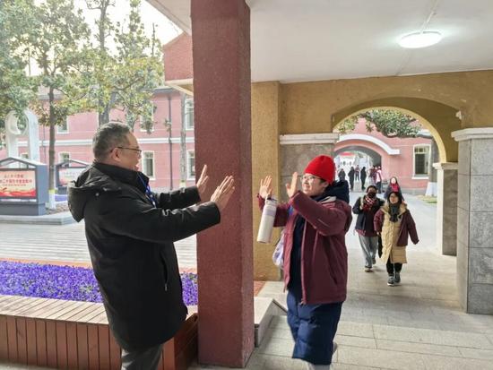 杭高唐新红书记在送考通道上与从容进校的考生一一击掌鼓劲。
