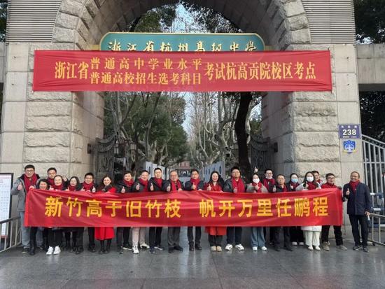 在所有考生进场完毕后,杭高唐新红书记携学校行政班子及各任课老师,在杭高贡院校门口拉起“新竹高于旧枝 帆开万里任鹏程”字样的祝福横幅,并齐声祝考生们“首考必胜”。
