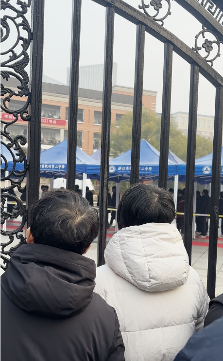 7:40 左右,杭二中滨江校区考生大多已进入考场,守在校门口的家长们却不愿离开,一个个透过铁门的缝隙,踮脚往里面望去,眼里满是牵挂。