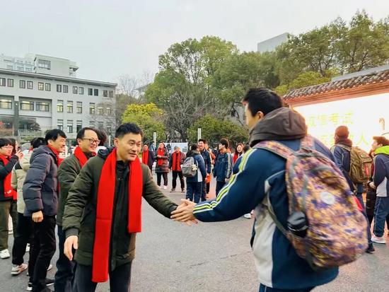 一早,杭州学军中学的行政班子、高三班主任及首考学科老师,全都系上喜庆的红围巾,早早守在校门口送考,与陆续入校的考生们或拥抱鼓劲,或击掌加油。