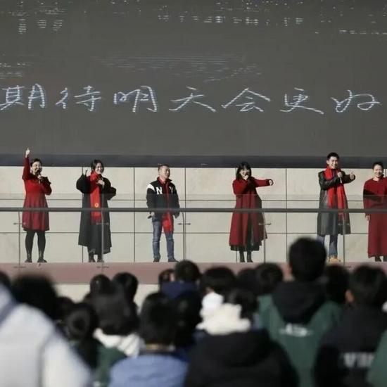 考前,杭州第二中学的老师们穿上红衣服、戴上红围巾,为即将迎来首考的学生们献唱《明天会更好》。