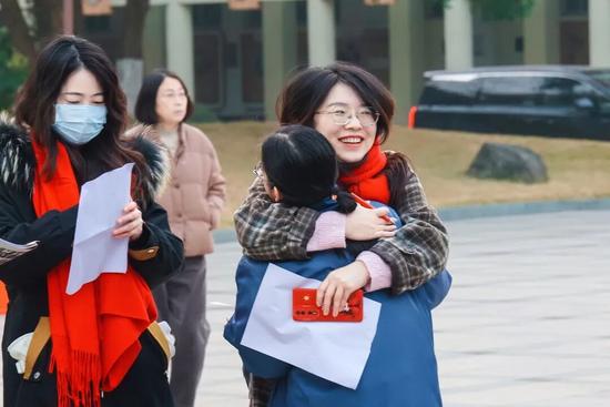 杭师大附中考点秩序井然,各项工作有条不紊地推进,为考生营造出安心应考的良好环境。考点外,一道亮丽的风景线格外引人注目——班主任们围着红围巾,笑容满面地迎接每一位考生。有的考生激动地索要拥抱,汲取温暖力量;有的考生认真讨要祝福,带着满满期许奔赴考场;还有的考生拉着班主任,要在这个意义非凡的日子合影留念,定格珍贵瞬间。这份师生间的深厚情谊,为紧张的首考增添了一抹温馨与感动。