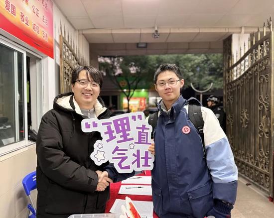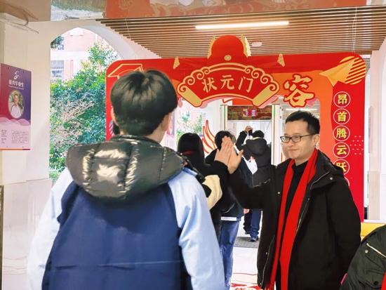 杭州市长河高级中学全体校级领导,高三班主任,高三物理老师与参加考试的学生击掌拥抱,暖心的话语鼓励同学们放平心态,首战开捷!