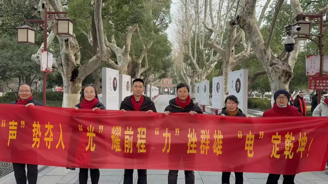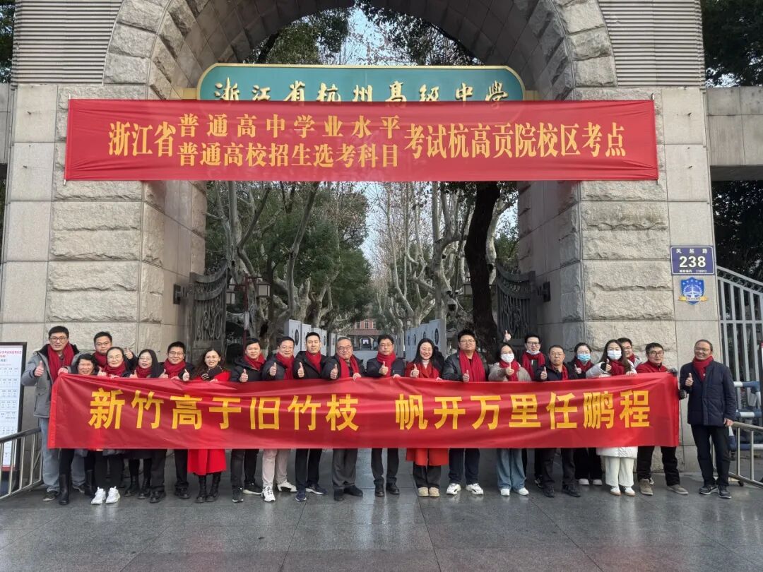 在所有考生进场完毕后,杭高唐新红书记携学校行政班子及各任课老师,在杭高贡院校门口拉起“新竹高于旧枝帆开万里任鹏程”字样的祝福横幅,并齐声祝考生们“首考必胜”。