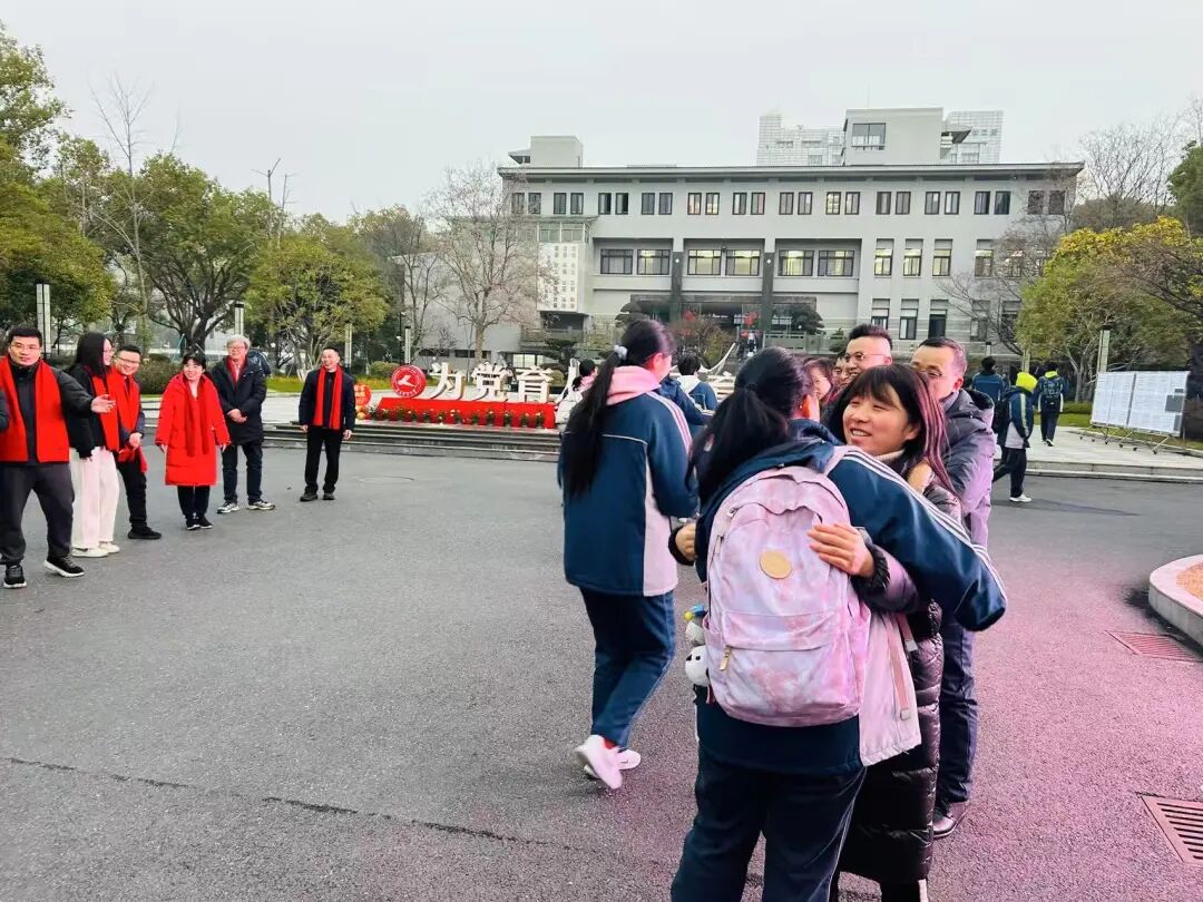 一早,杭州学军中学的行政班子、高三班主任及首考学科老师,全都系上喜庆的红围巾,早早守在校门口送考,与陆续入校的考生们或拥抱鼓劲,或击掌加油。