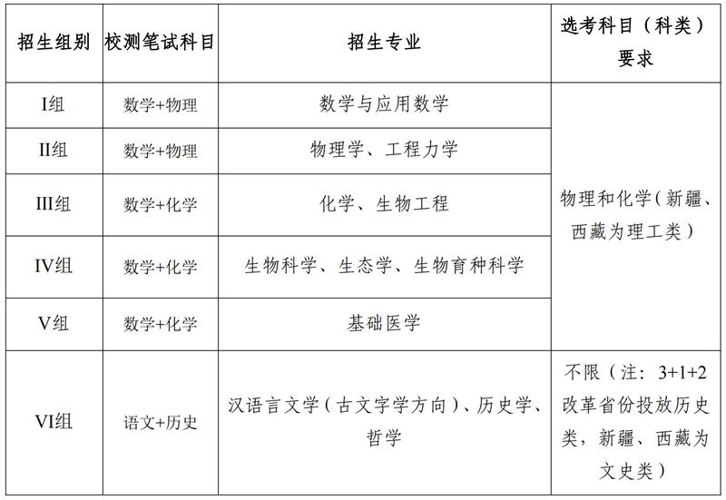 2.初试高考后出分前,已完成考试确认的第一类考生参加我校组织的初试,初试形式为笔试,具体安排详见后续我校本科生招生网最新公告。笔试科目:Ⅰ组和Ⅱ组为数学和物理,Ⅲ组、Ⅳ组和Ⅴ组为数学和化学,Ⅵ组为语文和历史。