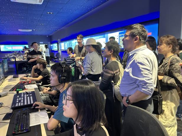 在演播楼的“4K综合演播室”、”智能媒体浙江省工程研究中心“和”历史影音资料智能修护实验室“,学员们走进实验室身临其境地体验了后台转播场景、影音资料数字化、智能化视频修复、超高清视频专业调色以及全景立体声修复与制作系统等。在AIGC校园打印相机前,学员们摆着姿势拍摄了个人专属的AI照片。