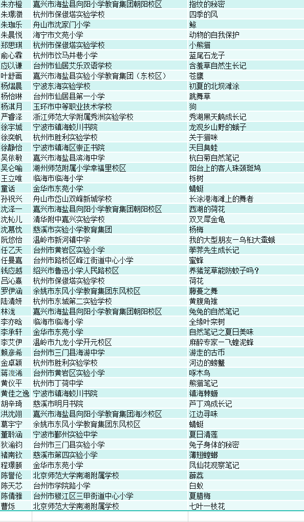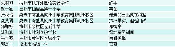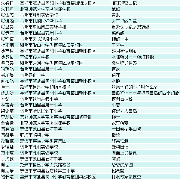 近日,经专家评委会的评选,第八届浙江省中小学自然笔记大赛获奖结果正式公布,评选出了一等奖8名、二等奖12名、三等奖30名、优胜奖50名以及优秀指导教师奖、最佳组织奖、浙江省中小学生自然笔记大赛创作基地。