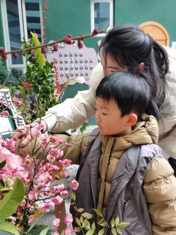 在“插春”时刻,孩子们手持精心挑选的鲜花、树枝,化身为小小园艺师,小心地将花插入精致花瓶、把树枝插进古朴陶罐,精心地装扮出他们心目中春天的样子。