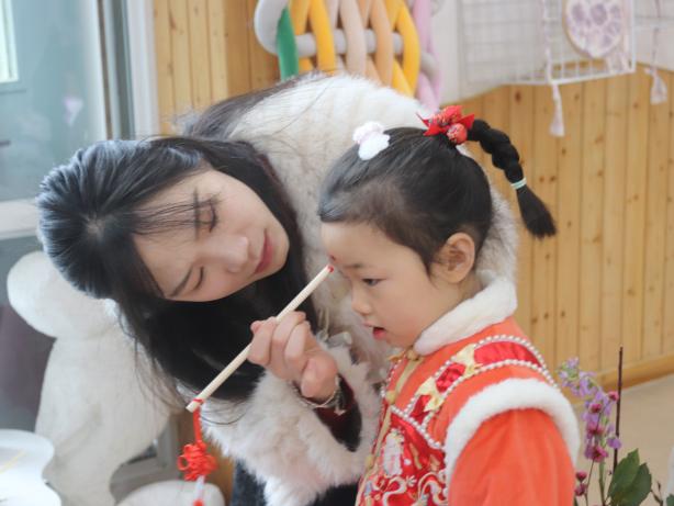 “躲春”环节,老师们温柔地为孩子们点朱砂、绑红绳,这一传统习俗不仅承载着长辈对晚辈的美好祝愿,更让孩子们在满满的仪式感中,深切感受到传统文化的温暖与呵护。
