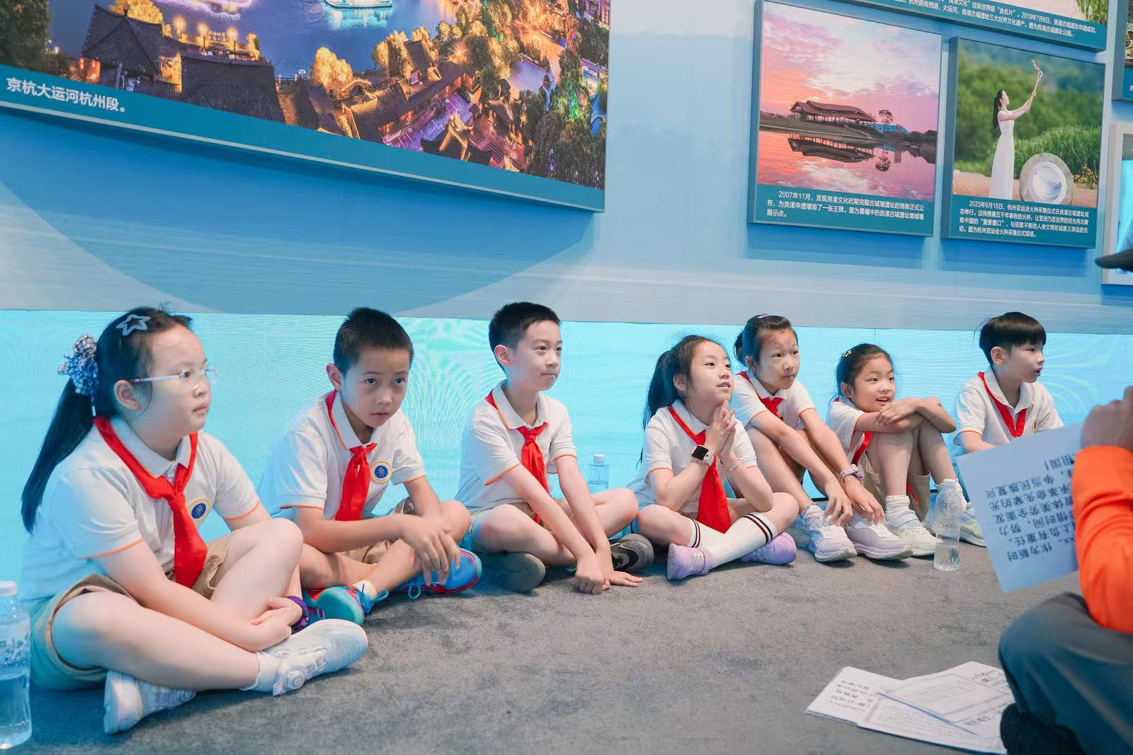 活动伊始,队员们参与了生动有趣的红色知识互动问答。从党的历史大事件到杭州本地的红色故事,一个个问题点燃了大家的求知欲。在你问我答间,队员们不仅巩固了红色知识,更跟着红领巾的足迹,透过展馆内的图片与资料,回望杭州在党的领导下走过的发展历程。