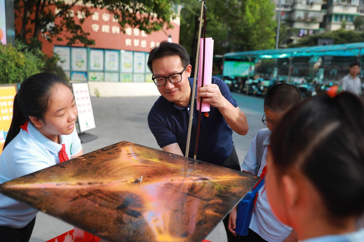 典礼开始前,孩子们在校园内体验了一系列精彩的科技小游戏。在“声音共振”实验中,孩子们通过观察物体振动,理解了声音的产生原理和共振现象。当他们看到物体在特定频率下产生剧烈振动时,都忍不住惊叹:“哇,声音原来这么神奇!”“掌中闪电”让孩子们近距离感受电流的魅力,特斯拉线圈产生的电弧和嗡嗡声让他们惊叹不已。孩子们小心翼翼地靠近,感受着电流的力量,仿佛触摸到了未来世界的边缘。“巧取乒乓球”实验锻炼了孩子们的动手实践能力,让他们在实践中掌握了气压差的原理。当乒乓球被神奇地“吸入”皮管时,孩子们欢呼雀跃:“太神奇了,就像魔法一样!”“穿墙而过”实验则巧妙地融入视错觉元素,让孩子们从新的角度理解科学现象。孩子们通过观察和体验,发现科学原来可以如此有趣。“克拉尼图形”实验更是让孩子们感受到了声波的神奇,他们通过观察图形的变化,了解了声波的传播方式。每个独一无二的克拉尼图形都像是声音在纸上画出的画,孩子们兴奋地说:“声音也可以画画,太厉害了!”