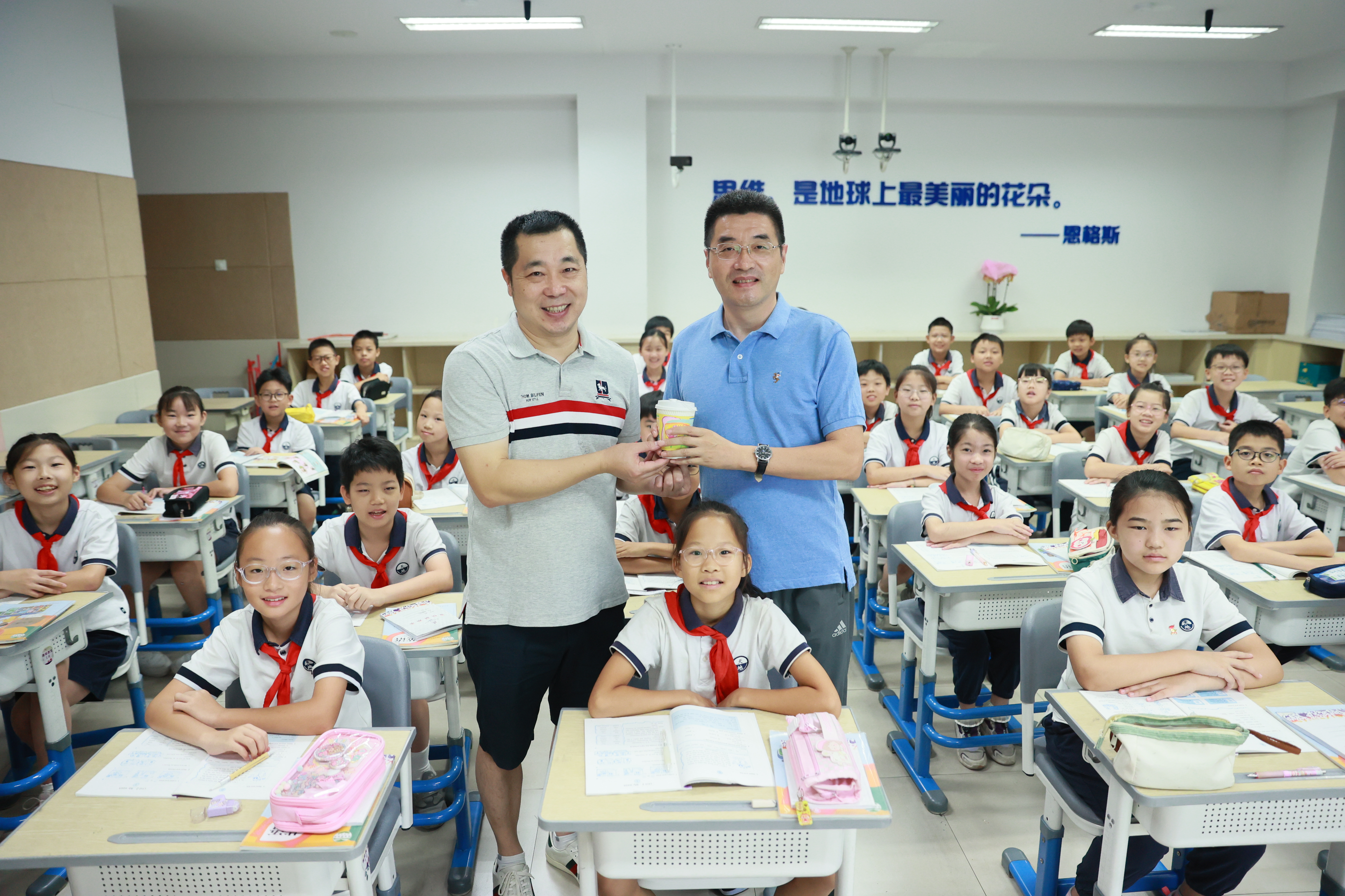 学校党总支书记龚钧煜、校长缪洪敏及副校长黄煜、钱春苗、沈贞带领行政团队,分头走进各个教室,与学生们一起为辛勤工作的老师们奉上敬师茶。“老师,您辛苦了!”“祝老师节日快乐!”一句句真挚的问候,一杯杯温暖的香茗,让这个教师节格外温馨动人。
