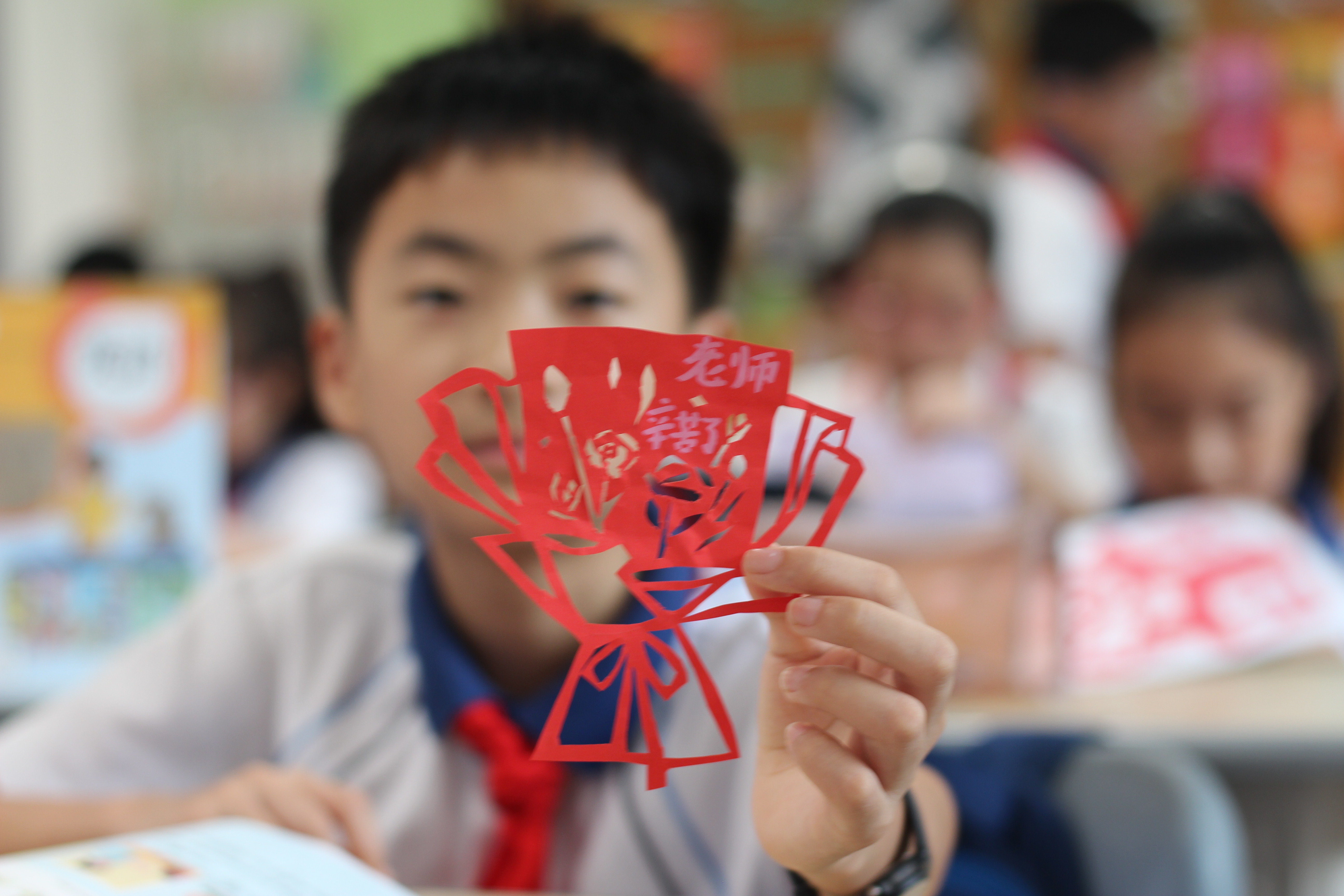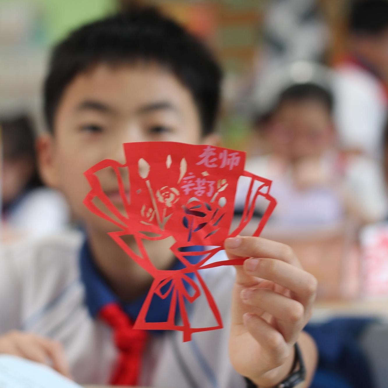 在教师节当天送给老师的作品中,有的剪出了教师的可爱小样,将老师的形象生动呈现;有的剪出 “谢谢您” 等真挚话语,直白传递心中感激;还有的剪出了花束、师生温情场景,定格校园里的美好瞬间。这些作品虽然稚嫩,却饱含着孩子们对老师深深的敬爱与感恩。