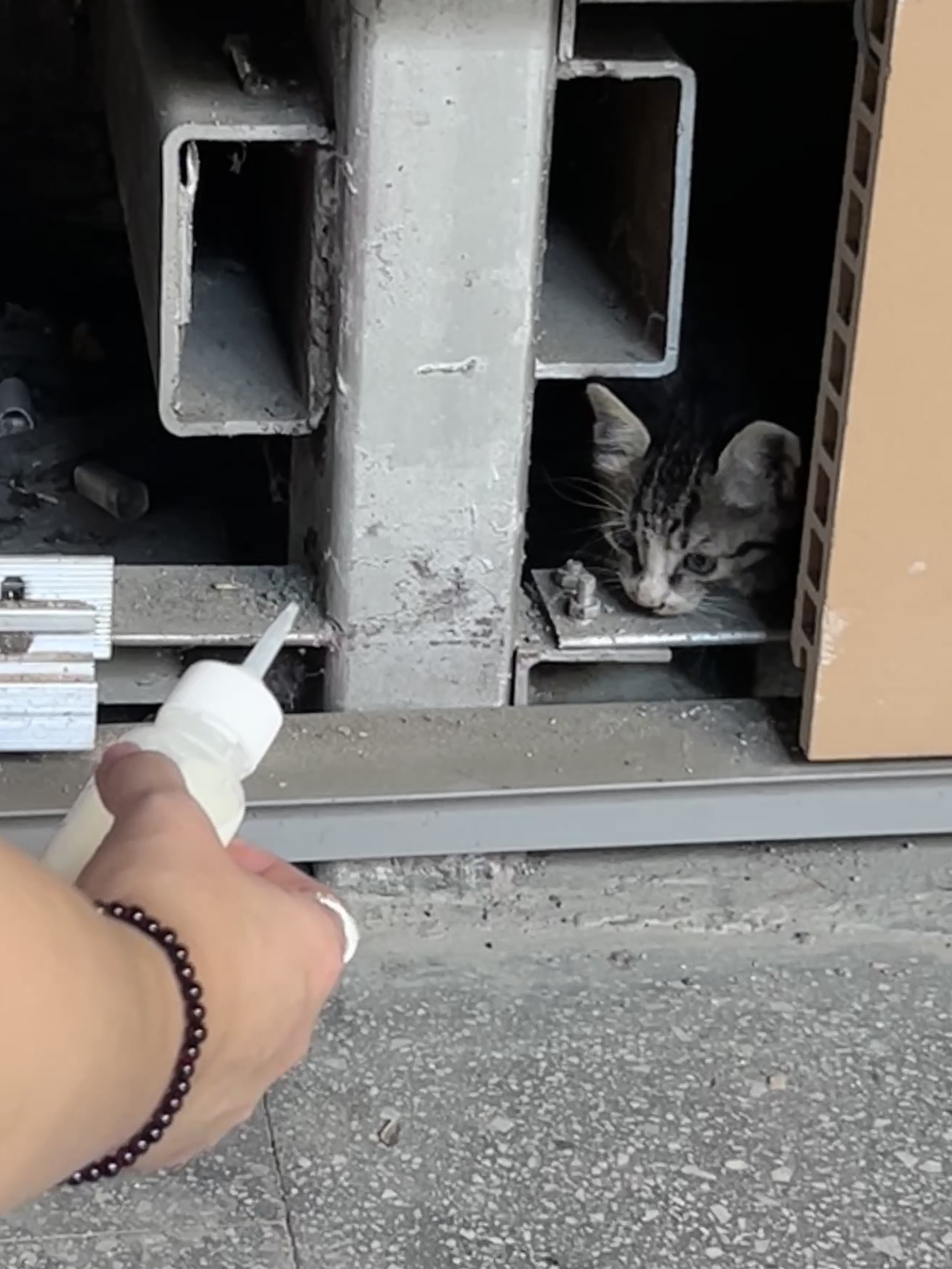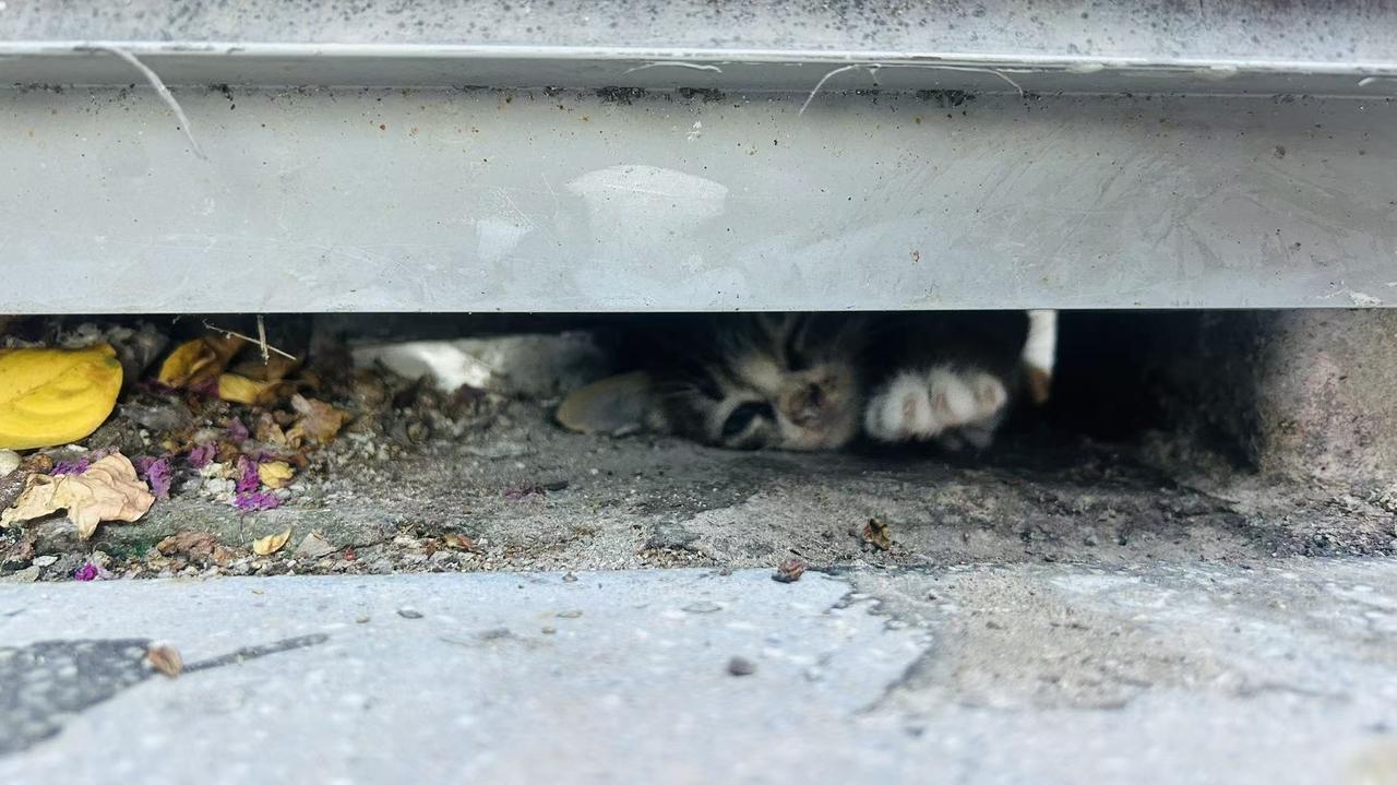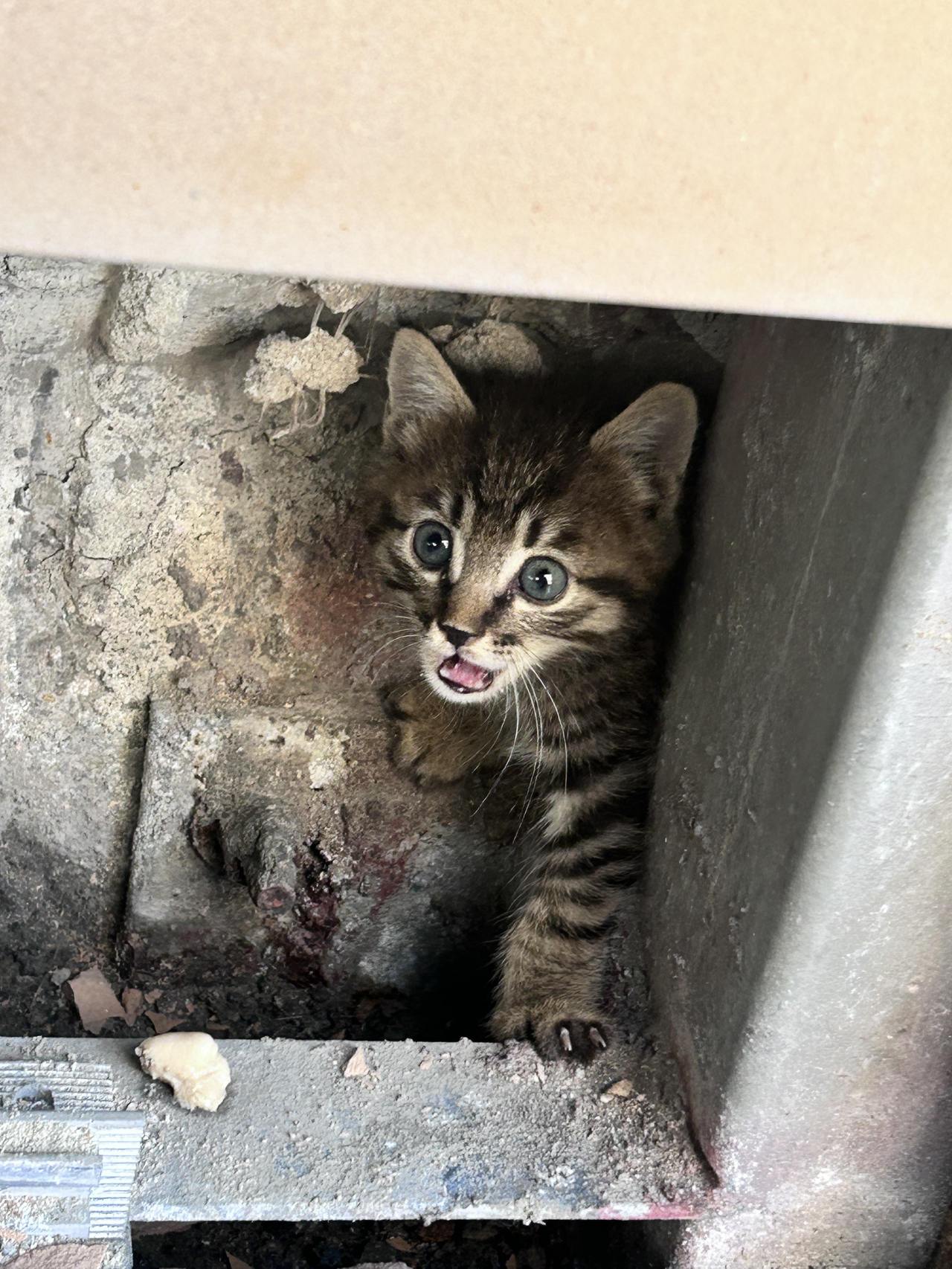 最初发现墙壁缝隙里有猫咪的,是学校几位细心的同学。一开始,他们听见教学楼的墙缝中隐约传出微弱的喵喵声,断断续续。有好奇的同学俯身探看,还在缝隙深处瞥见了一抹小小的、颤动的爪子影子。