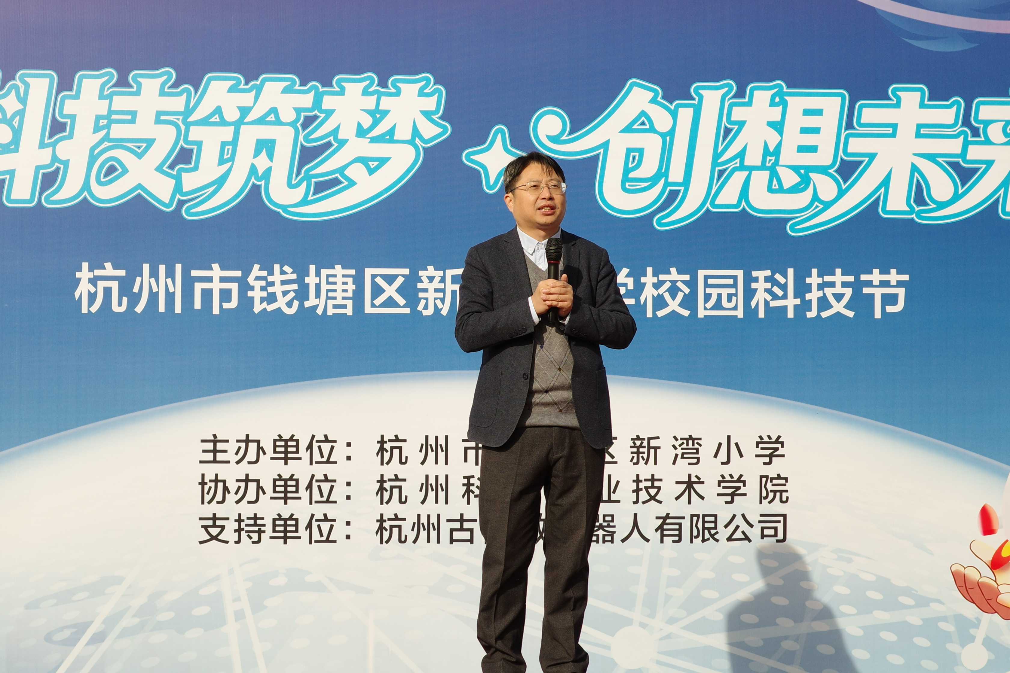 上午9时,科技节开幕式率先点燃热情。新湾小学校长葛明没有讲枯燥的大道理,而是用“小鸟为什么能飞?机器人能干活?”等趣味提问开场,瞬间拉近与学生的距离:“科技不是课本上的公式,是今天大家亲手做的每一个小实验!”随后,杭州科技职业技术学院智能制造学院副院长、新制造培训学院副院长谢茂青为学子们寄语并宣布开幕,操场上掌声与欢呼声交织,不少学生已经攥紧游园卡,期待着接下来的“科学闯关”。