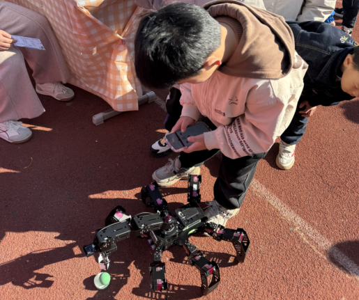 除了趣味实验,前沿科技体验区更是让孩子们直呼“打开新世界”。餐盘计价仪、风格打印机、六足机器人……这些应有尽有!瞧!在“协作机器人”摊位,两学生一组,操控机器人手臂完成“搭积木”挑战;“3D 打印”摊位前,透明罩里的打印机正在层层“画出”卡通模型,五六年级的学生围在周围,好奇地观察打印过程;最受欢迎的“遥控碰碰车”区域,每当两辆车“嘭 地相撞,就会引发一阵欢呼,孩子们在竞技中不知不觉锻炼了手眼协调能力。