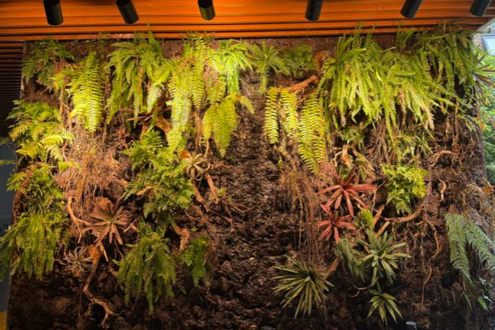 水从顶部蜿蜒而下,浸润过层层苔藓,汇入底部水池。积水凤梨的叶片像向上张开的手掌,接着水滴,也接着窗外的阳光。孩子们路过时,总会停下来,伸手接一滴水,或者蹲下身,看孔雀鱼追逐孑孓。